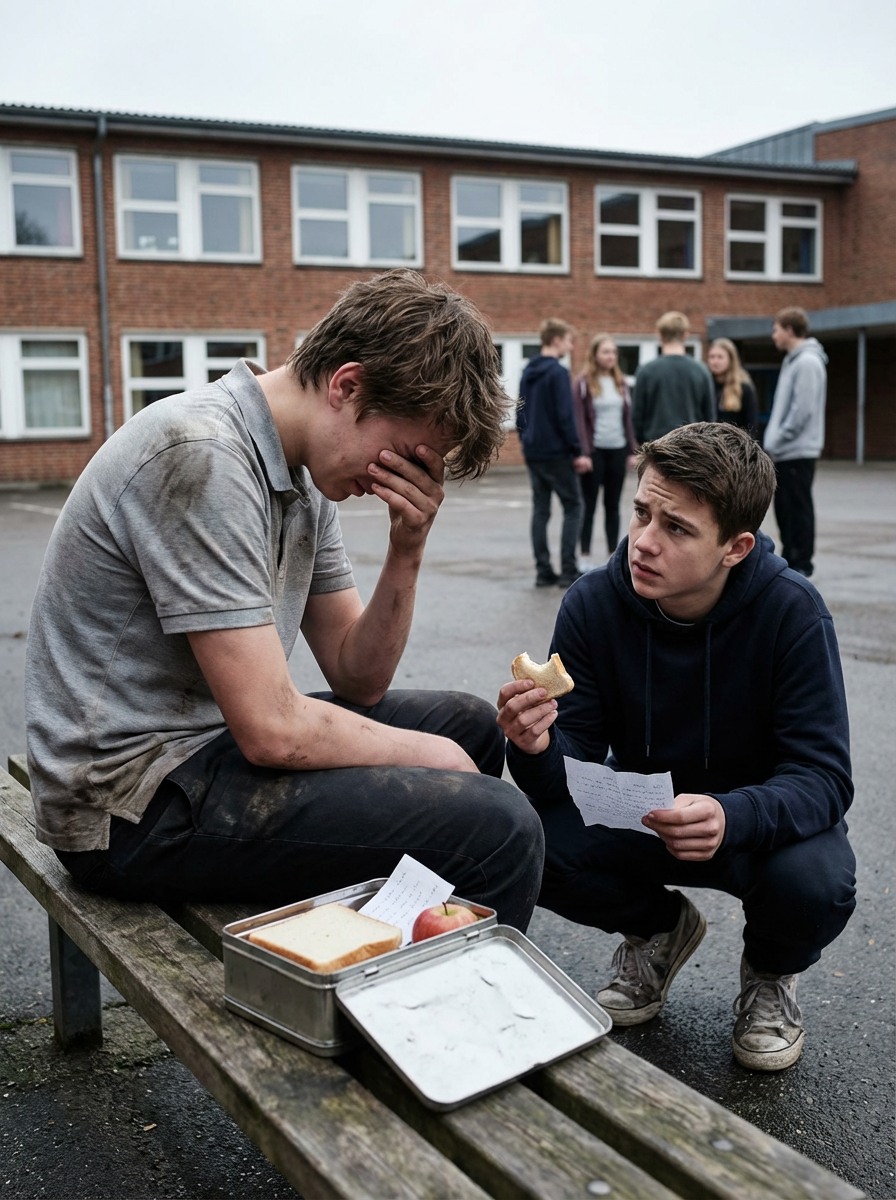 Rubavo il pranzo al povero ragazzo per umiliarlo… finché non ho letto il biglietto di sua madre e mi si è spezzato il cuore.